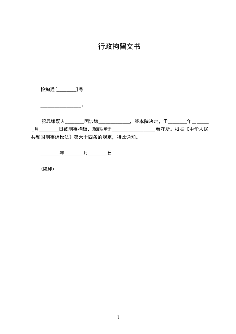 犯罪嫌疑人________因涉嫌_____________,经本院决定,于________年________月________日被刑事拘留,现羁押于__________________看守所。根据《中华人民共和国刑事诉讼法》第六十四条的规定,特此通知。
