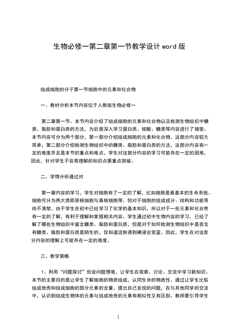 七、教学过程教学过程教学意图复习提问在学习新课之前,我们一起回顾一下,我们上一章学习的内容,生命系统的结构层次有小到大的排序是怎样的?原核细胞和真核细胞本质区别是什么?复习已学内容,并激发学生学习新知识的兴趣。同非生命的物质一样,细胞也是由分子组成的。细胞具有生命特征,那组成细胞的分子与组成非生命物质的分子相比有无特殊之处呢?通过本章内容的学习我们就会知道答案。创设问题情境学生活动:比较组成地壳和组成细胞的部分元素的含量,提出自己发现的问题,在与其他同学的交流中,认识到组成生物体的元素与组成地壳的元素有相似性又有区别。教师活动:针对学生提出的问题,教师要引导学生分析表中信息。教师小节:组成细胞的元素在地壳都能找到,生物界与无机自然界具有统一性;而细胞与非生物相比,各种元素的相对含量又不相同,说明生物界与无机自然界具有差异性。引导学生读表提取信息,通过了解细胞的物质组成,认同生命的物质性。组成细胞的元素教师活动:提问:组成细胞的元素有多少种?它们在含量上有何差别?学生活动:交流、讨论并回答问题。教师小节:按照含量的多少把元素分为两大类:一类是大量元素(C、H、O、N、P、S、K、Ca、Mg),一类是微量元素(Fe、Mn、Zn、Cu、B、Mo)。教师活动:引导学生观察课本图2-1和2-2,解释鲜重和干重的含义,并提出问题:从表中可以看出,细胞鲜重和干重状态下,含量最多的一种元素分别是?含量最多的四种元素分别是?学生活动:识图、分析,讨论并回答问题。教师小结:碳是组成细胞的最基本元素,并说明原因;碳、氢、氧、氮是组成细胞的基本元素,并说明原因。教师活动:既然微量元素在生物体内含量很少,那么,是不是说它们在生物体内可有可无呢?由于学生在初中已经学习了化学的基本知识,所以较为容易理解学习这部分内容。通过提问的方式,加强学生的交流合作意识。学生活动:相互讨论后,得出结论。教师小结:微量元素是生物体不可缺少的必需元素;在生物体中含量很少,但其作用是其它元素不可替代的。组成生物体的化合物教师活动:提问:组成细胞的元素以什么形式存在呢?利用思考与讨论的问题引导学生分析图表。学生活动:分析图表,思考讨论下列问题