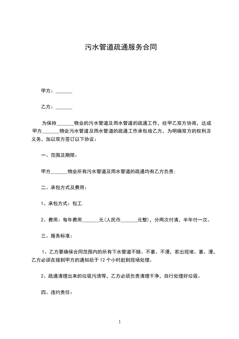 为保持花桥物业的污水管道及雨水管道的疏通工作,经甲乙双方协商,达成甲方花桥物业污水管道及雨水管道的疏通工作承包给乙方,为明确双方的权利及义务,加以双方签订以下协议: