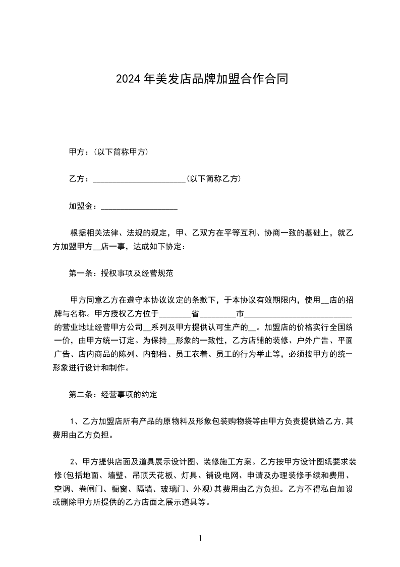 根据相关法律、法规的规定,甲、乙双方在平等互利、协商一致的基础上,就乙方加盟甲方__店一事,达成如下协定: