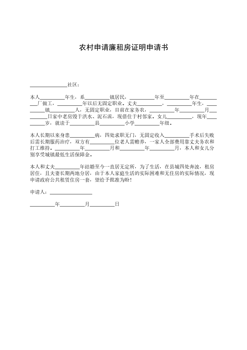 我婚后丈夫陈XX(江平镇劳动路69号)是个无定业人员,过去一直随我居住单位宿舍,单位后,我也下岗了,宿舍也拆迁了,(丈夫家里无住房,现在也无房产了),下岗后,住房得不到安置,只好在外面租住,后来在亲友们的热心帮助下,我们来到了市人民医院做了临时工,生活暂时XX下来,可工资不多,供女儿读大学,这样我们是无能力买得起高价住房的。幸好国家有政策照顾下岗职工、困难户、低收入的家庭可申请廉租房居住,现我向贵办申请,恳请贵办根据我俩的实际住房困难给予解决一套住房为盼。