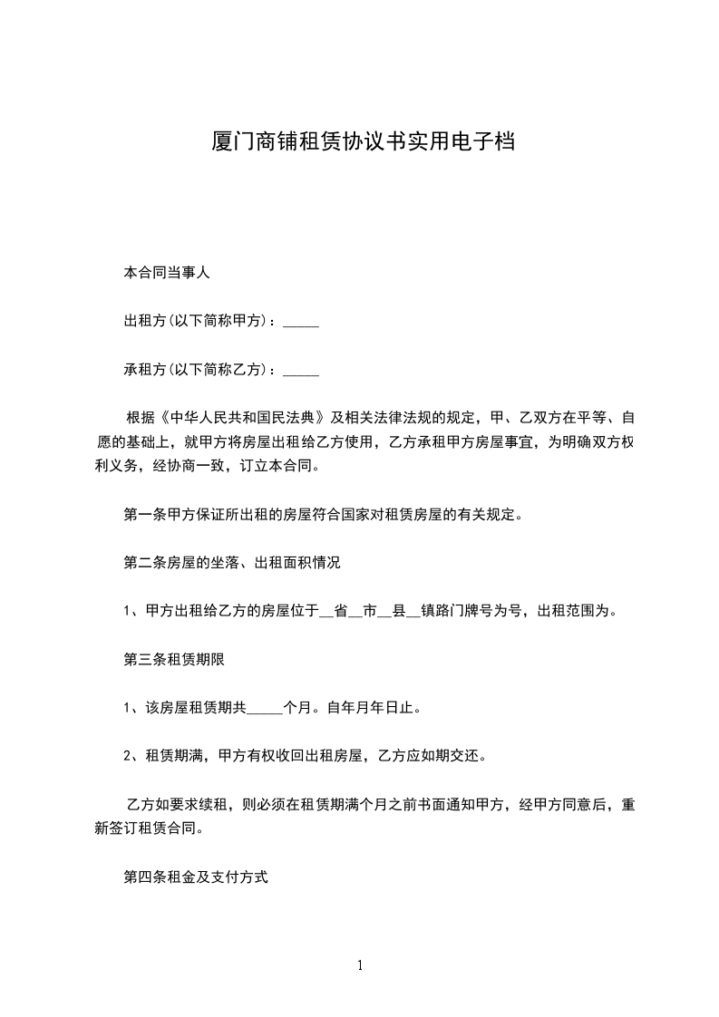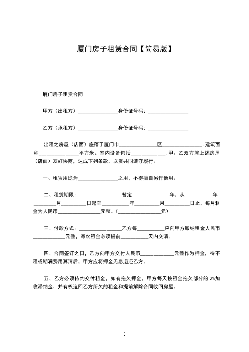出租之房屋(店面)座落于厦门市_______________区________________.建筑面积_______________平方米。室内设备包括_____________.甲、乙双方就上述房屋(店面)友好协商,达成下列条款,以资共同遵守履行。