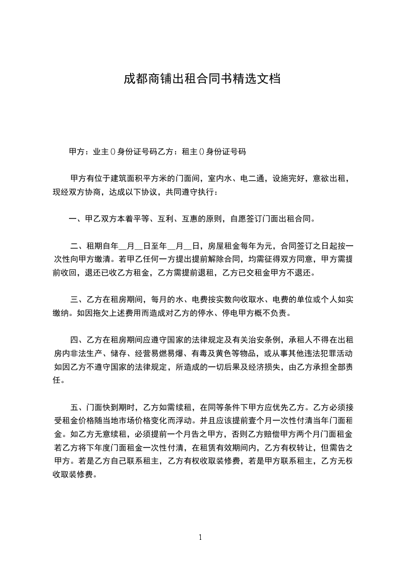 甲方有位于建筑面积平方米的门面间,室内水、电二通,设施完好,意欲出租,现经双方协商,达成以下协议,共同遵守执行: