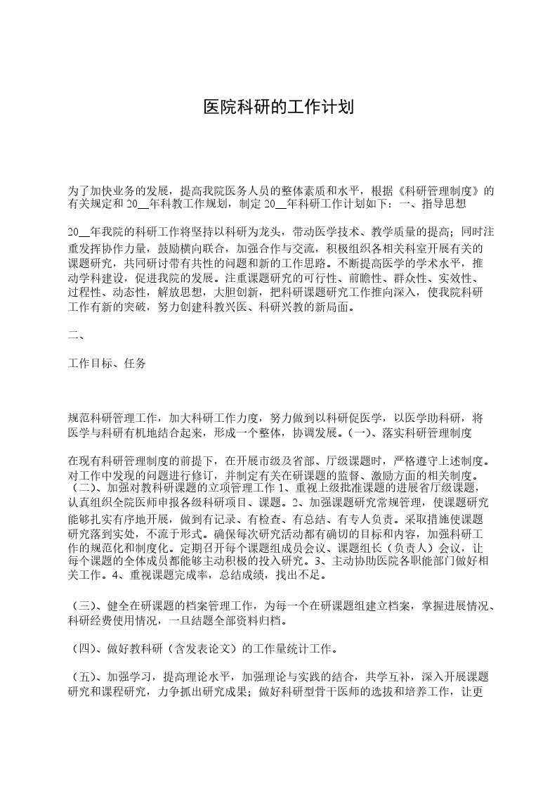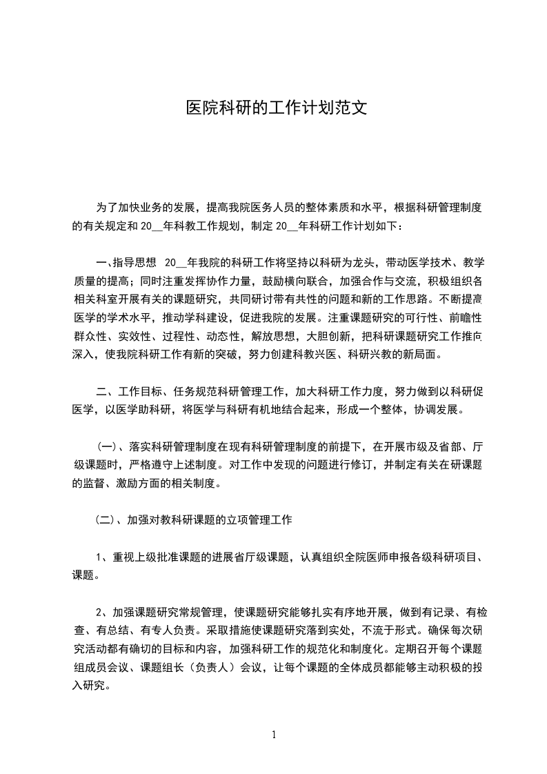 为了加快业务的发展,提高我院医务人员的整体素质和水平,根据科研管理制度的有关规定和20__年科教工作规划,制定20__年科研工作计划如下: