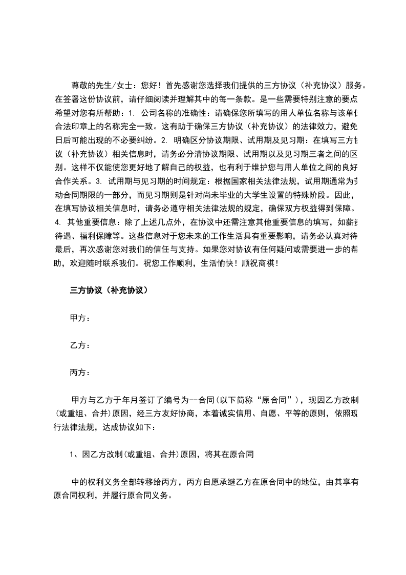 甲方与乙方于20xx年月签订了编号为--合同(以下简称“原合同”),现因乙方改制(或重组、合并)原因,经三方友好协商,本着诚实信用、自愿、平等的原则,依照现行法律法规,达成协议如下: