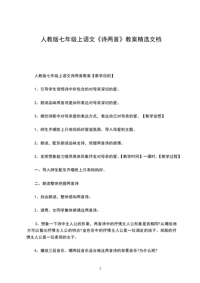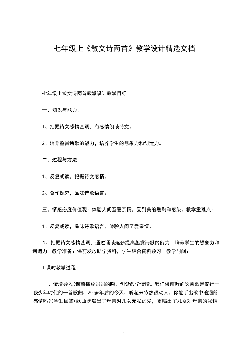 一、情境导入(课前播放妈妈的吻,创设教学情境。我们课前听的这首歌是流行于我少年时代的一首歌曲,20多年后的今天,听起来依然很动人。你能听出歌中蕴涵的感情吗?(学生回答)歌曲既唱出了母亲对儿女无私的爱,更唱出了儿女对母亲的深情的倾诉,这种真切的母子深情不会因为时空流转而改变,这是人类永恒的主题。今天,我们就一起走进散文诗两首,接受一次更美的亲情洗礼吧!