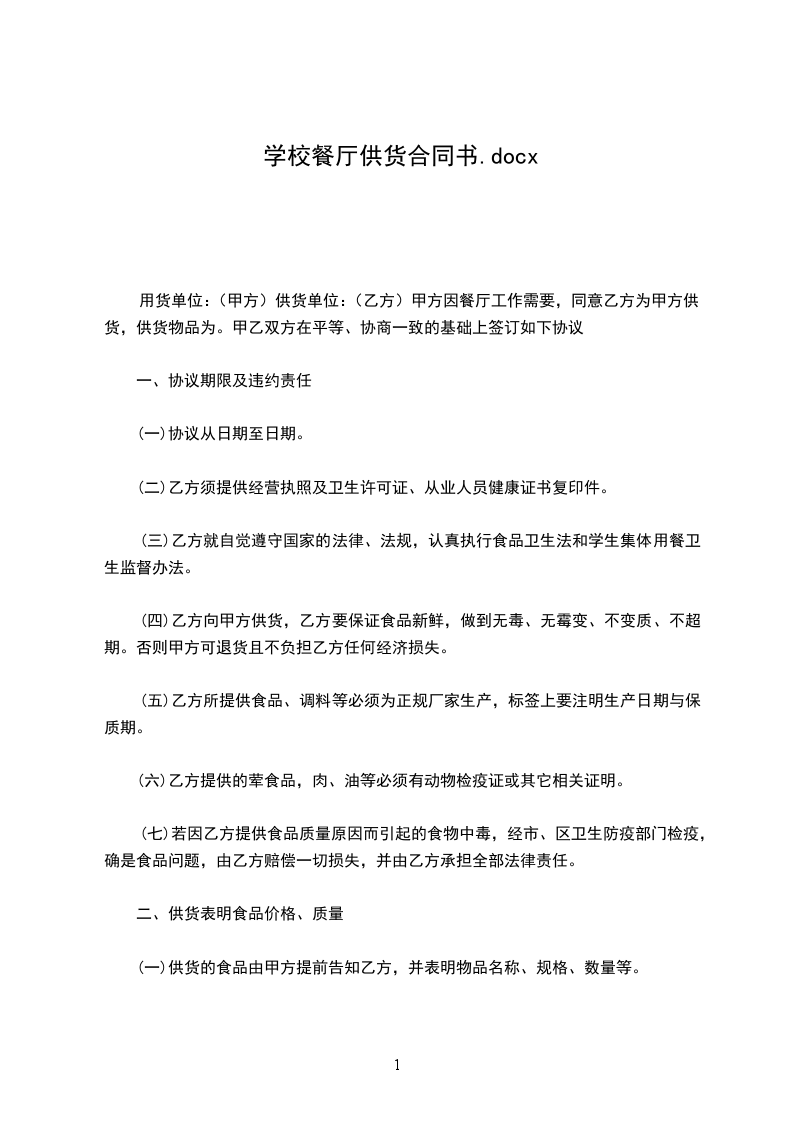 用货单位:(甲方)供货单位:(乙方)甲方因餐厅工作需要,同意乙方为甲方供货,供货物品为。甲乙双方在平等、协商一致的基础上签订如下协议
