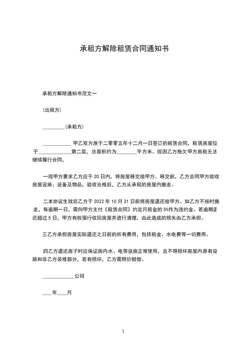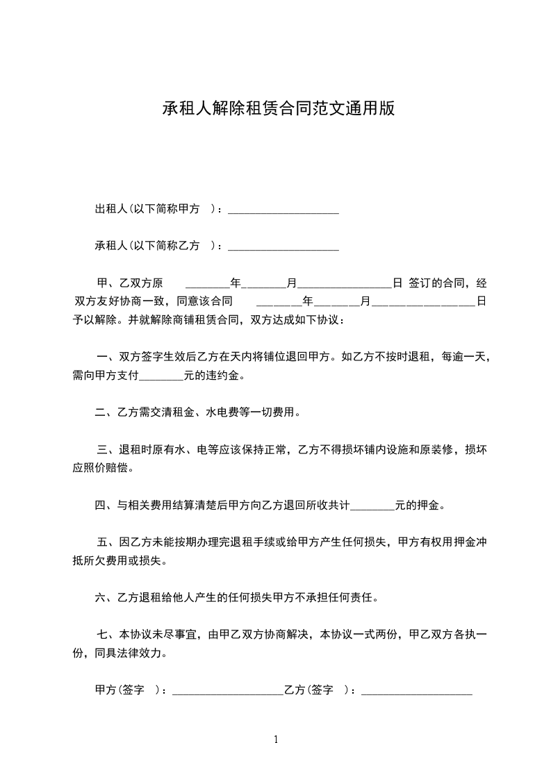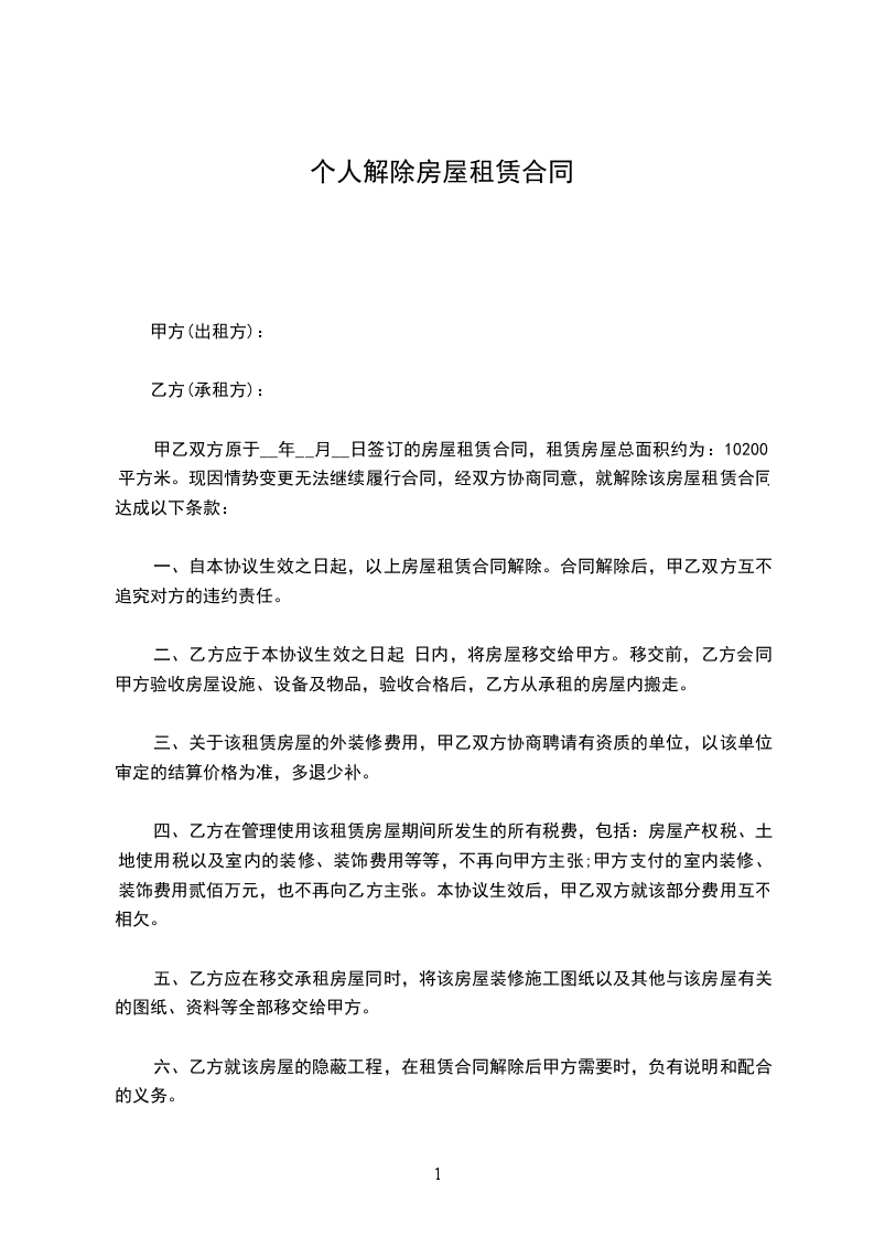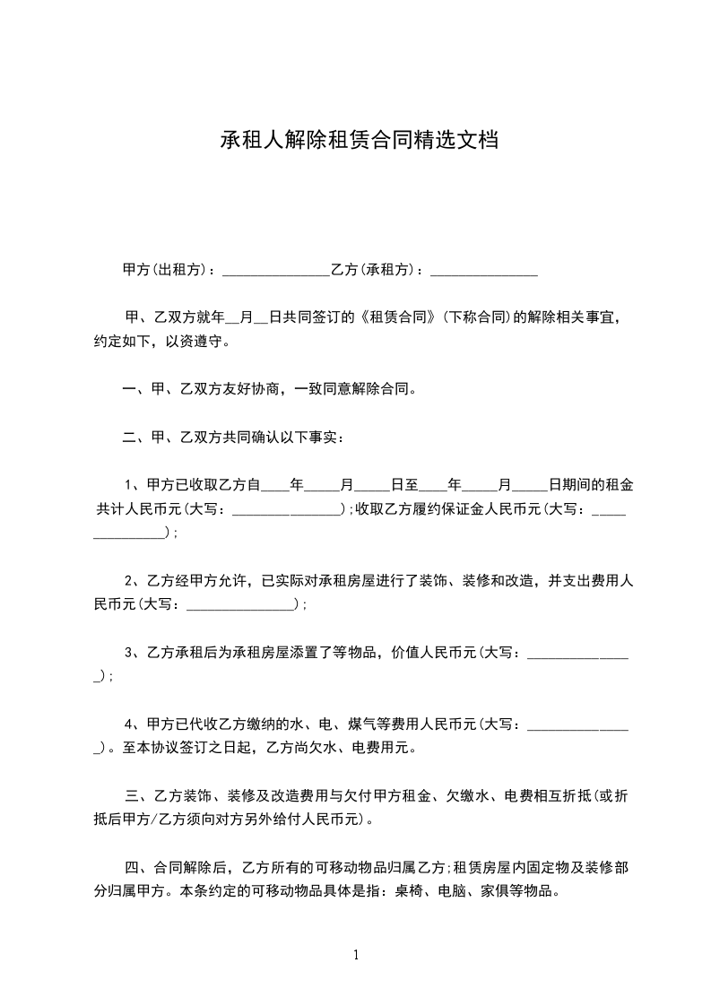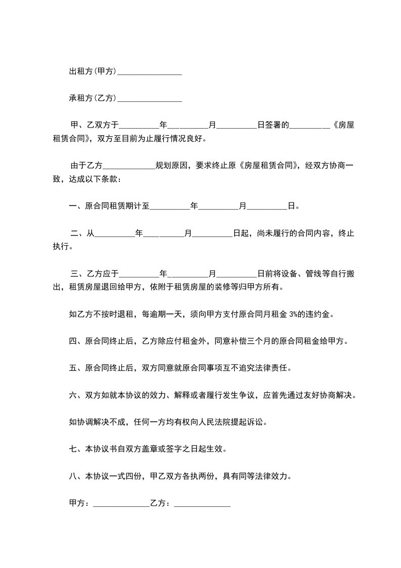 甲、乙双方就_____年_____月_____日共同签订的《租赁合同》(下称合同)的解除相关事宜,约定如下,以资遵守。