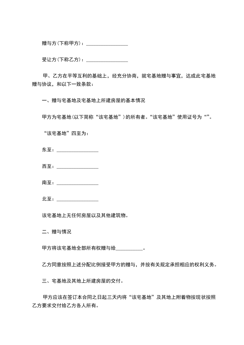 甲、乙方在平等互利的基础上,经充分协商,就宅基地赠与事宜,达成此宅基地赠与协议,和以下一致条款:
