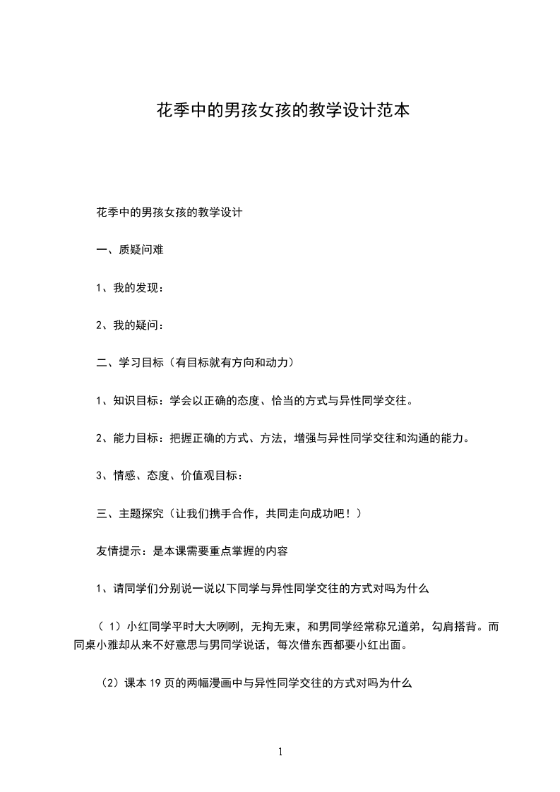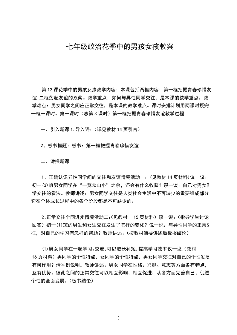 第12课花季中的男孩女孩教学内容:本课包括两框内容:第一框把握青春珍惜友谊;二框荡起友谊的双桨。教学重点:如何与异性同学交往,是本课的教学重点。教学难点:男女同学之间应正常交往,是本课的教学难点。课时安排计划用两课时授完,一框一课时。第一课时(总第3课时)第一框把握青春珍惜友谊教学过程
