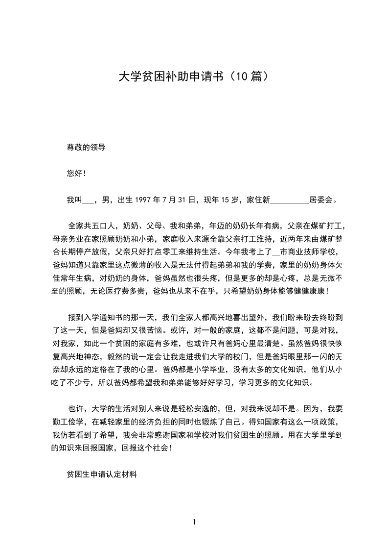 大学贫困补助申请书4