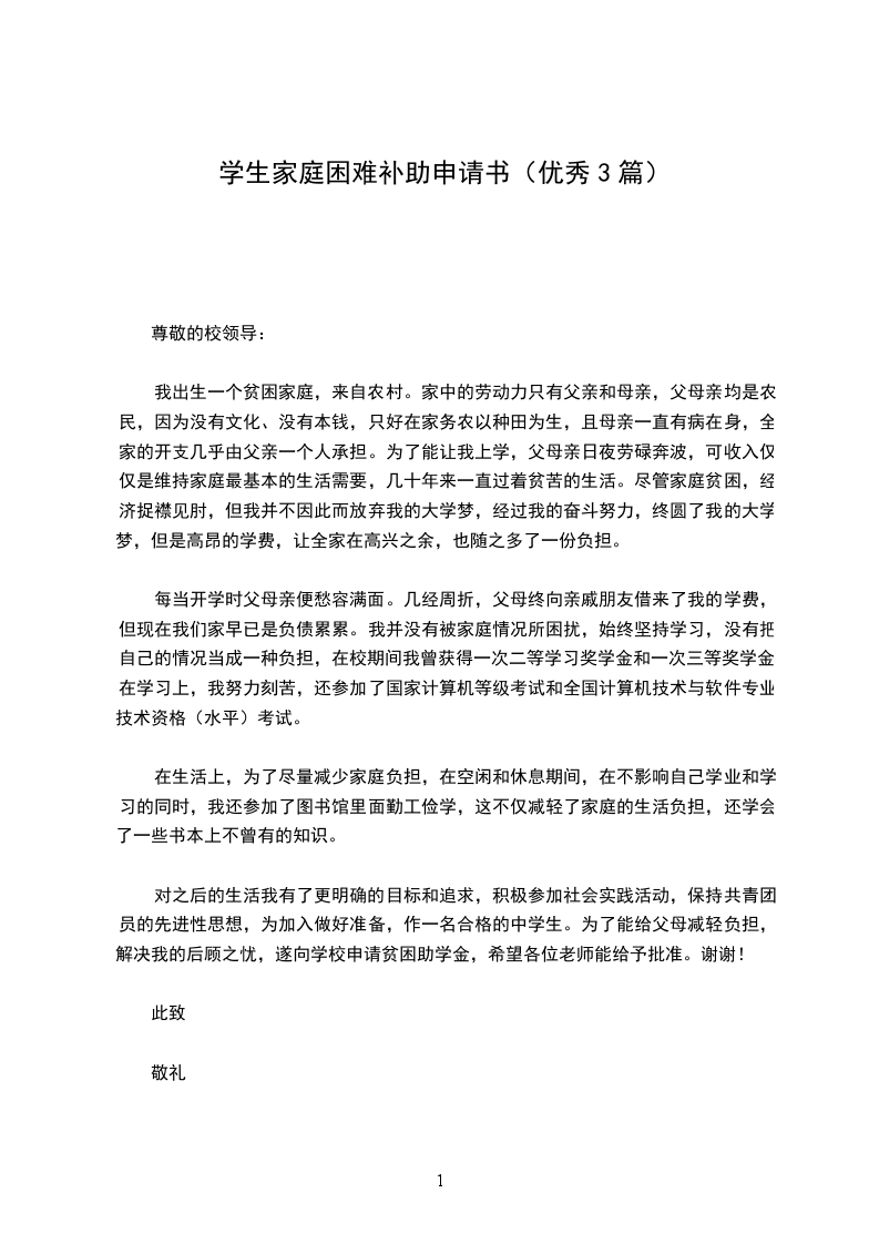 家中现在还有一位85岁高龄的奶奶,__年4月因一次交通事故伤了脑部神经,肇事人虽然赔付了医疗费用,但出院后因留下后遗症导致生活不能自理,现在依然在世,不仅生活上需要人照顾,而且也需要药物来维持,也因此借了不少钱。弟弟现在还在上学,每年的学费也是一笔不小的开支。因父母都是农民,整个家庭的收入就只剩下我的工资和父母不到2亩地的收入。考虑到家里实在困难,特此向有关部门提出申请困难职工补助,希望予以审核批准!此致敬礼!