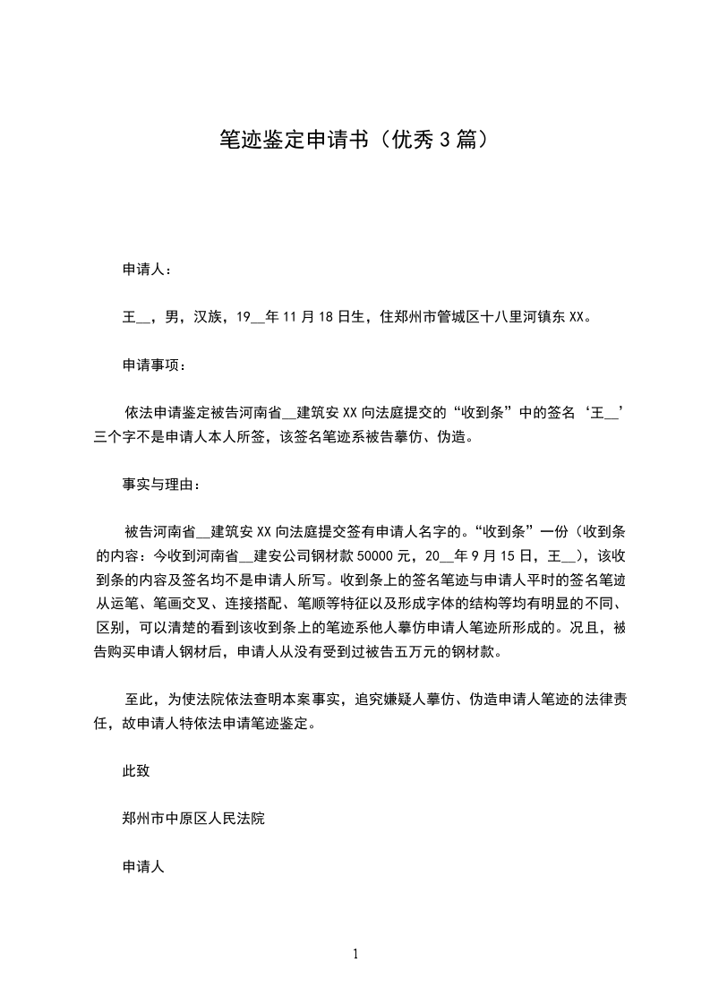 依法申请鉴定被告河南省__建筑安XX向法庭提交的“收到条”中的签名‘王__’三个字不是申请人本人所签,该签名笔迹系被告摹仿、伪造。