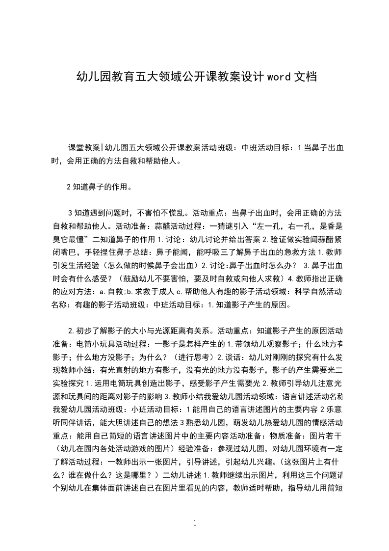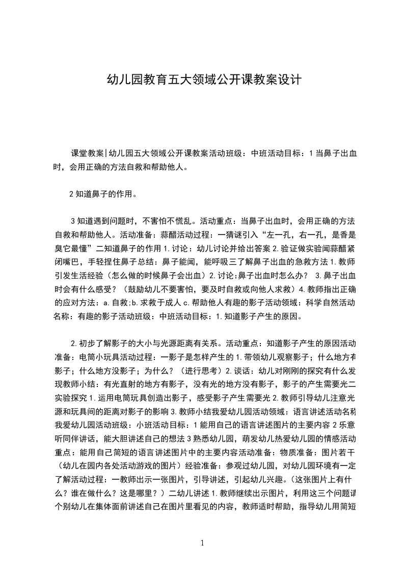 课堂教案|幼儿园五大领域公开课教案活动班级:中班活动目标:1当鼻子出血时,会用正确的方法自救和帮助他人。