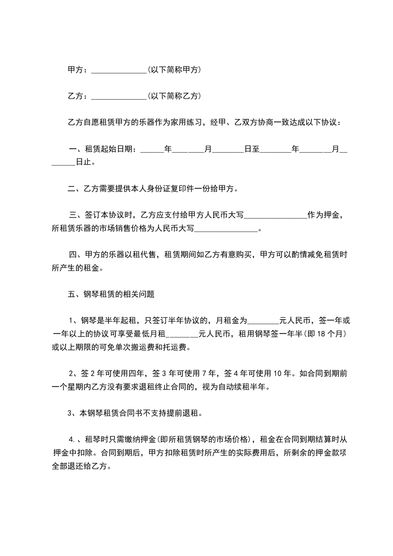 乙方自愿租赁甲方的乐器作为家用练习,经甲、乙双方协商一致达成以下协议: