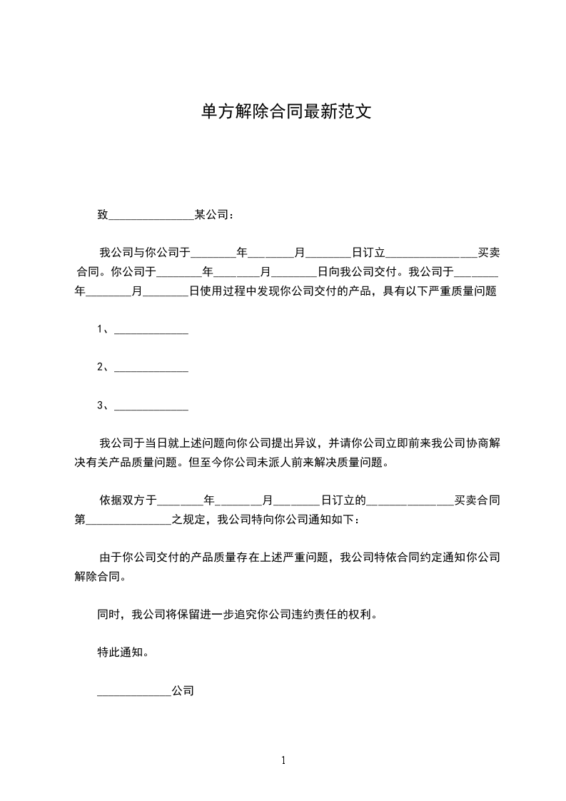 由于你公司交付的产品质量存在上述严重问题,我公司特依合同约定通知你公司解除合同。