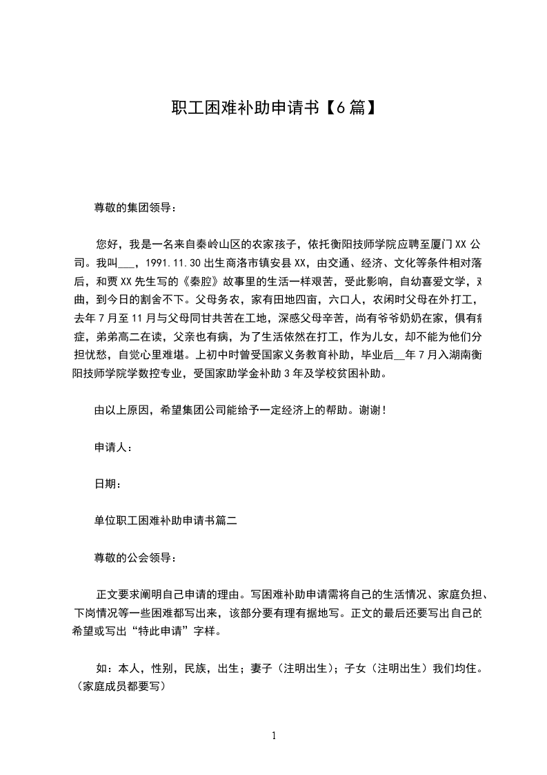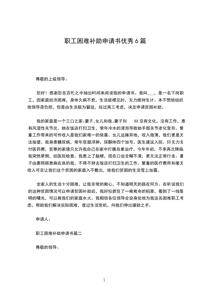 我叫___,现年_岁,(原)是公司所属___的一名在岗职工,工龄_年,现在___幼儿园教书;女儿___17岁,在__中学上高二,儿子___在靖边六中读初三。现由家庭经济困难,特向公司申请补助。