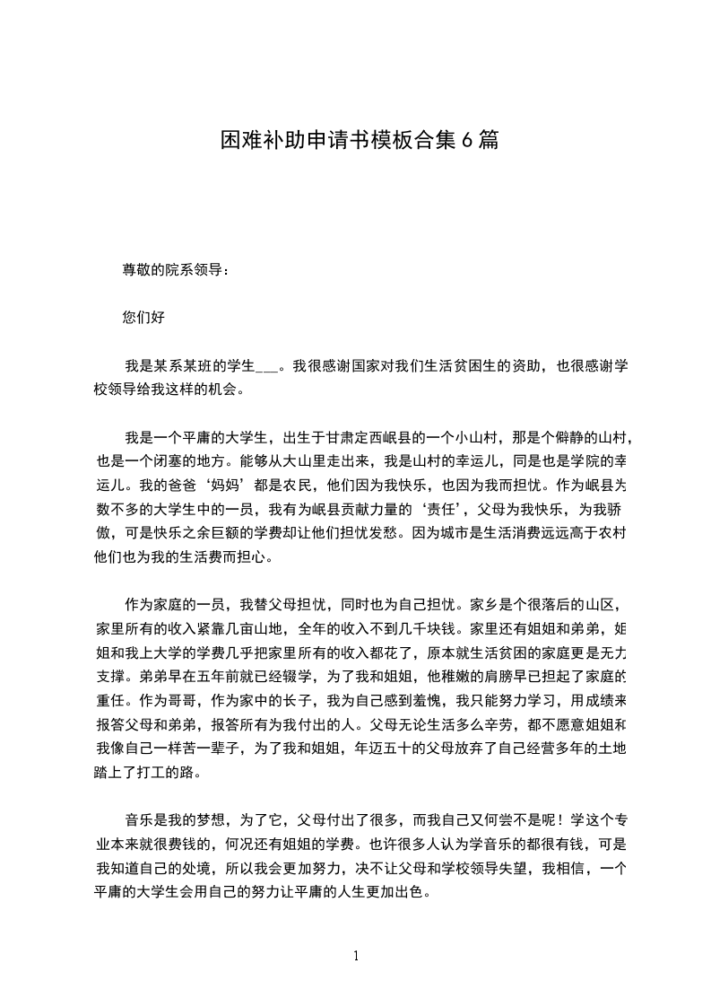 您们好!我是____级__本科_班的学生,家住在农村,父母是农民,知识水平不高,我们家是村上的贫困户,重点扶助对象。