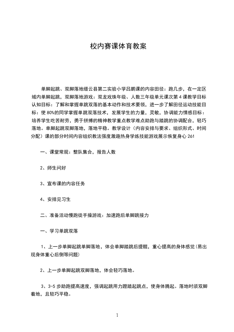 单脚起跳、双脚落地缙云县第二实验小学吕鹏课的内容田径:跑几步,在一定区域内单脚起跳,双脚落地游戏:双龙戏珠年级、人数三年级单元课次第4课教学目标认知目标:了解和掌握单跳双落的基本动作和技术要领,进一步了解田径运动技能目标:使80%的同学掌握单跳双落技术,发展学生的力量,灵敏,协调能力情感目标:培养学生吃苦耐劳,勇于拼搏的精神教学重点教学难点助跑与踏跳的协调配合,轻巧落地。单脚起跳双脚落地,落地平稳。教学设计(内容安排与要求、组织形式、时间分配)课的部分时间内容组织教法强度激趣热身学练技能游戏展示恢复身心261