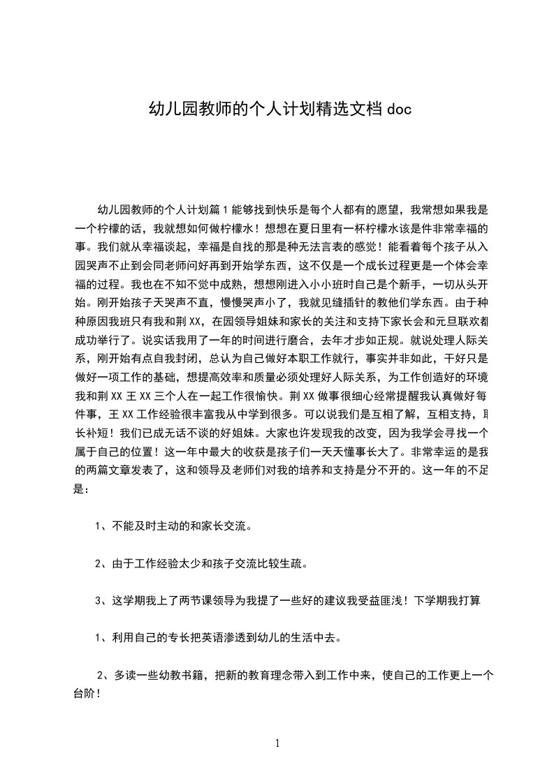 幼儿园教师的个人计划篇1能够找到快乐是每个人都有的愿望,我常想如果我是一个柠檬的话,我就想如何做柠檬水!想想在夏日里有一杯柠檬水该是件非常幸福的事。我们就从幸福谈起,幸福是自找的那是种无法言表的感觉!能看着每个孩子从入园哭声不止到会同老师问好再到开始学东西,这不仅是一个成长过程更是一个体会幸福的过程。我也在不知不觉中成熟,想想刚进入小小班时自己是个新手,一切从头开始。刚开始孩子天哭声不直,慢慢哭声小了,我就见缝插针的教他们学东西。由于种种原因我班只有我和荆XX,在园领导姐妹和家长的关注和支持下家长会和元旦联欢都成功举行了。说实话我用了一年的时间进行磨合,去年才步如正规。就说处理人际关系,刚开始有点自我封闭,总认为自己做好本职工作就行,事实并非如此,干好只是做好一项工作的基础,想提高效率和质量必须处理好人际关系,为工作创造好的环境。我和荆XX王XX三个人在一起工作很愉快。荆XX做事很细心经常提醒我认真做好每件事,王XX工作经验很丰富我从中学到很多。可以说我们是互相了解,互相支持,取长补短!我们已成无话不谈的好姐妹。大家也许发现我的改变,因为我学会寻找一个属于自己的位置!这一年中最大的收获是孩子们一天天懂事长大了。非常幸运的是我的两篇文章发表了,这和领导及老师们对我的培养和支持是分不开的。这一年的不足是: