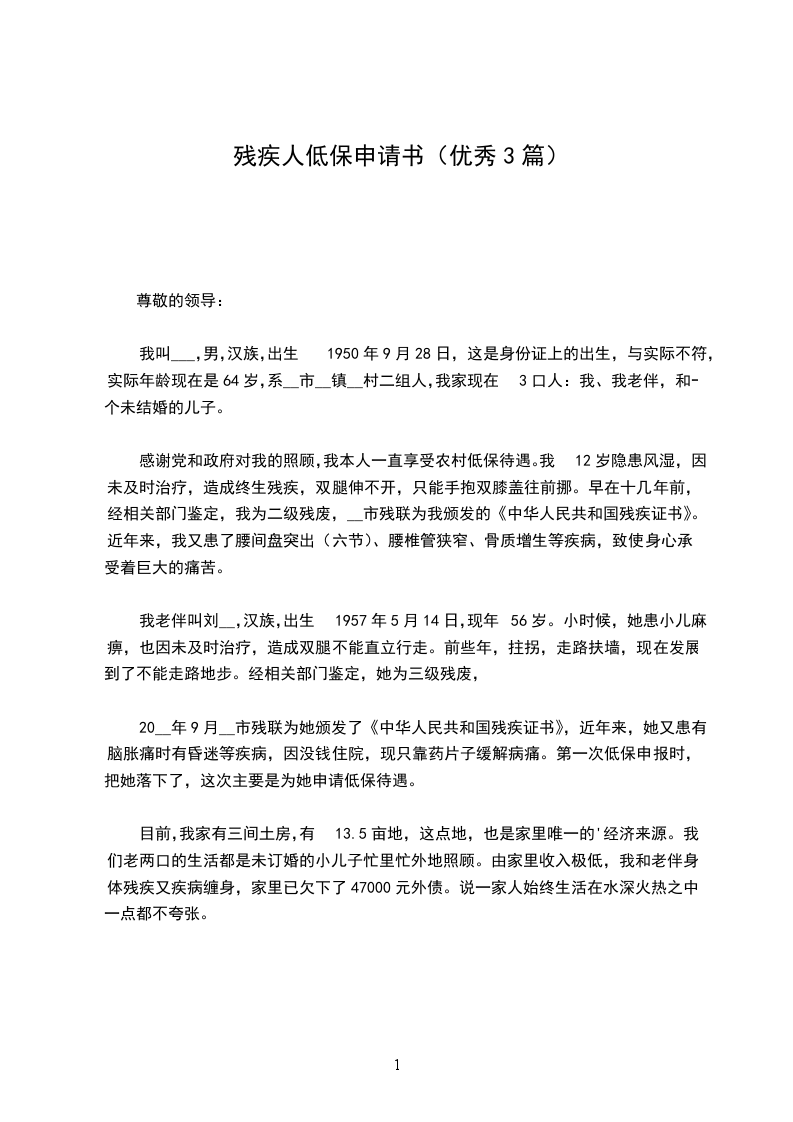 残疾人低保申请书篇三