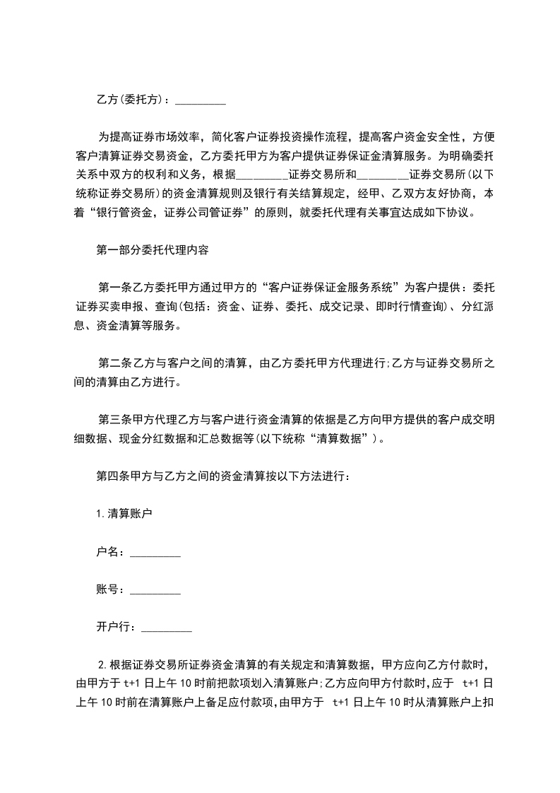为提高证券市场效率,简化客户证券投资操作流程,提高客户资金安全性,方便客户清算证券交易资金,乙方委托甲方为客户提供证券保证金清算服务。为明确委托关系中双方的权利和义务,根据上海证券交易所和深圳证券交易所(以下统称证券交易所)的资金清算规则及银行有关结算规定,经甲、乙双方友好协商,本着“银行管资金,证券公司管证券”的原则,就委托代理有关事宜达成如下协议。