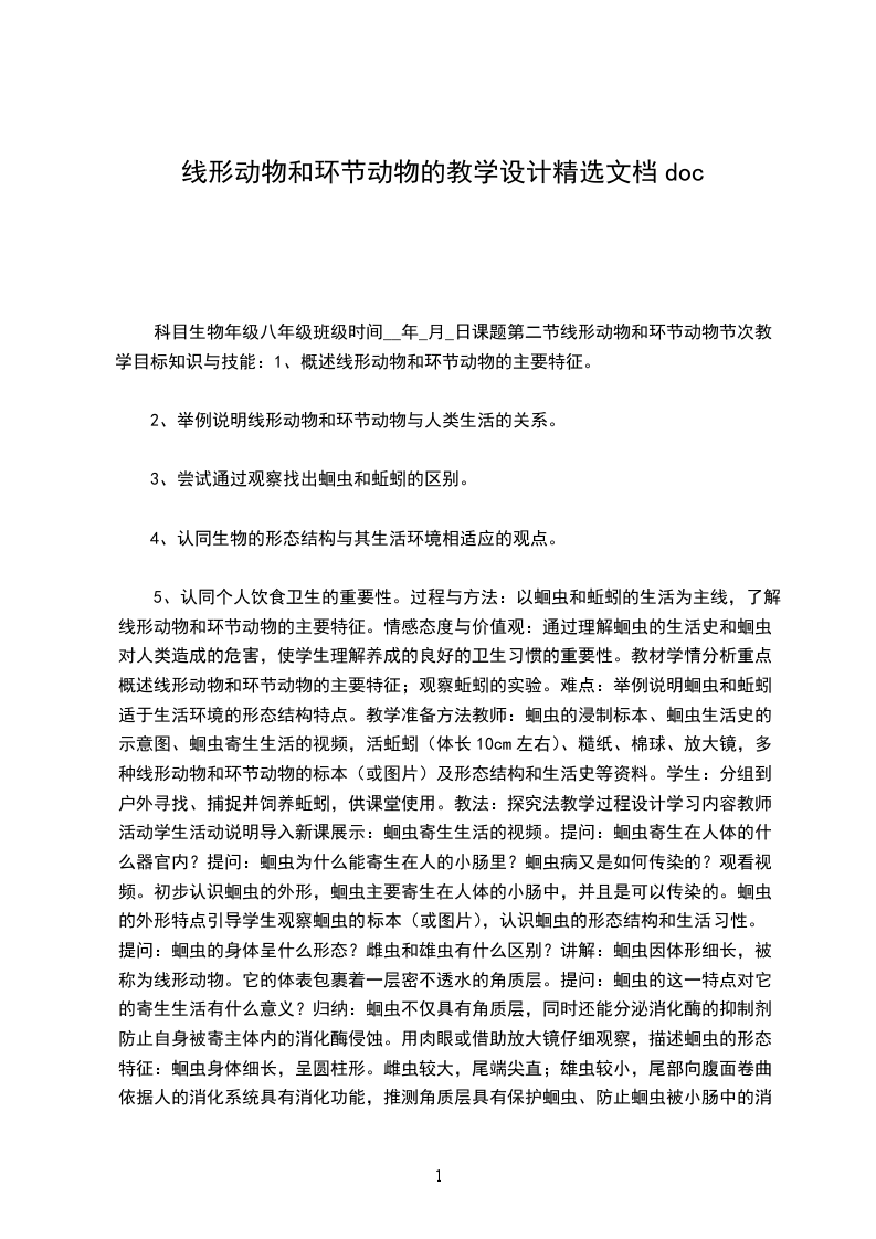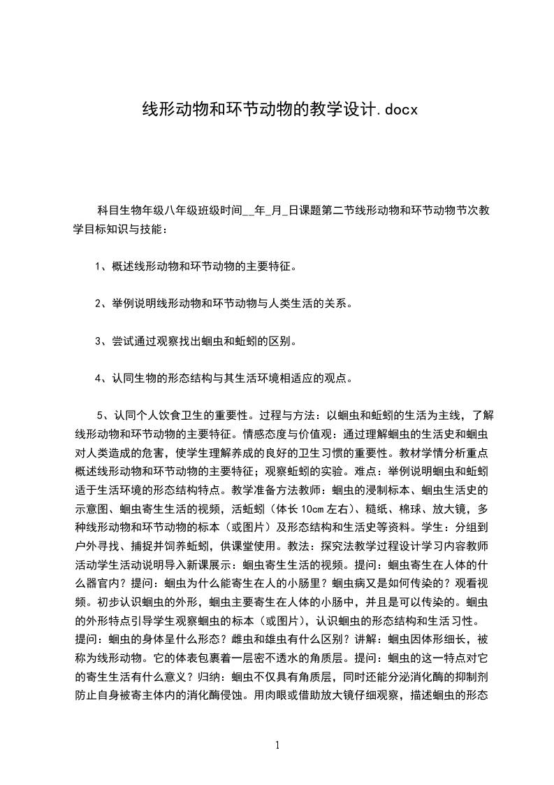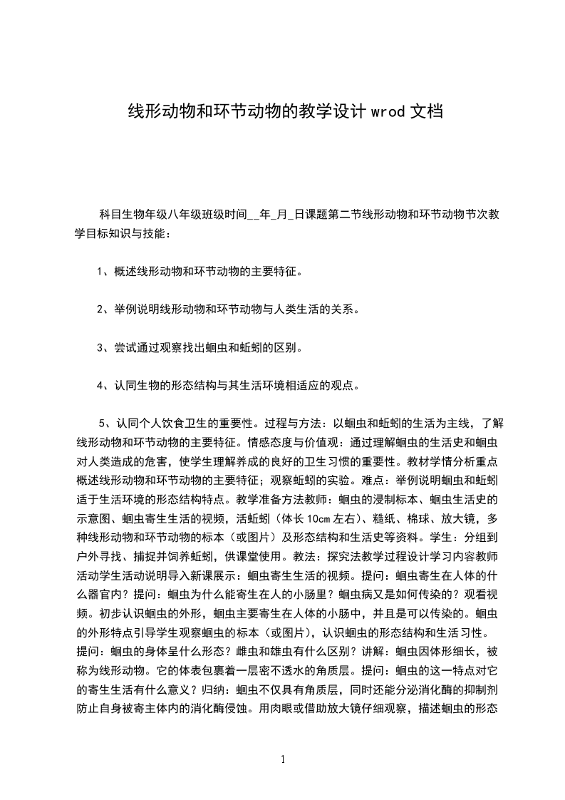 科目生物年级八年级班级时间__年_月_日课题第二节线形动物和环节动物节次教学目标知识与技能:1、概述线形动物和环节动物的主要特征。