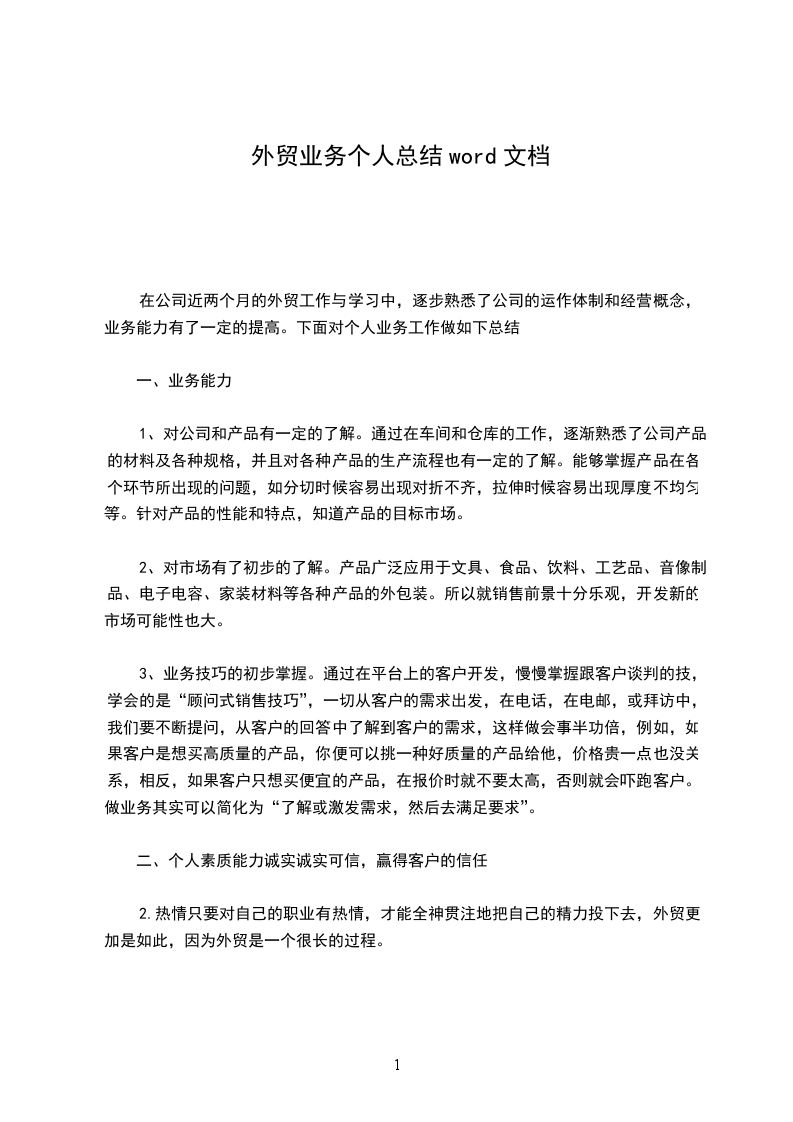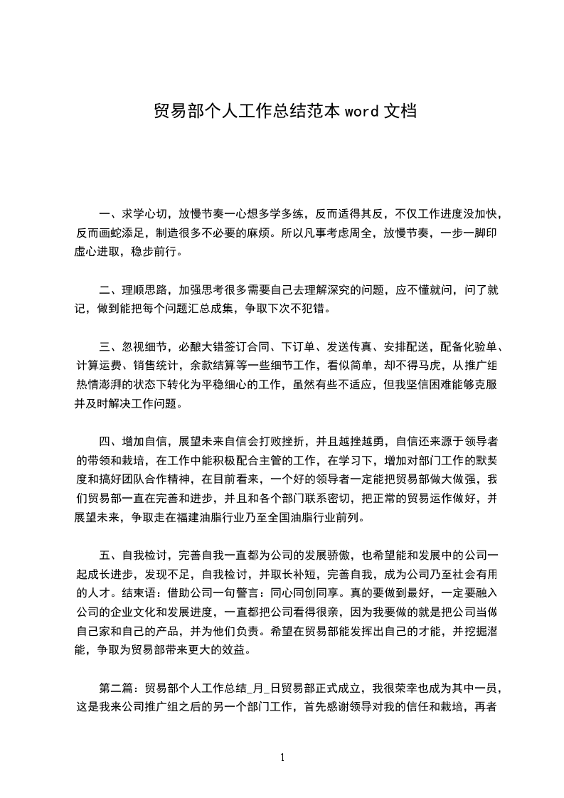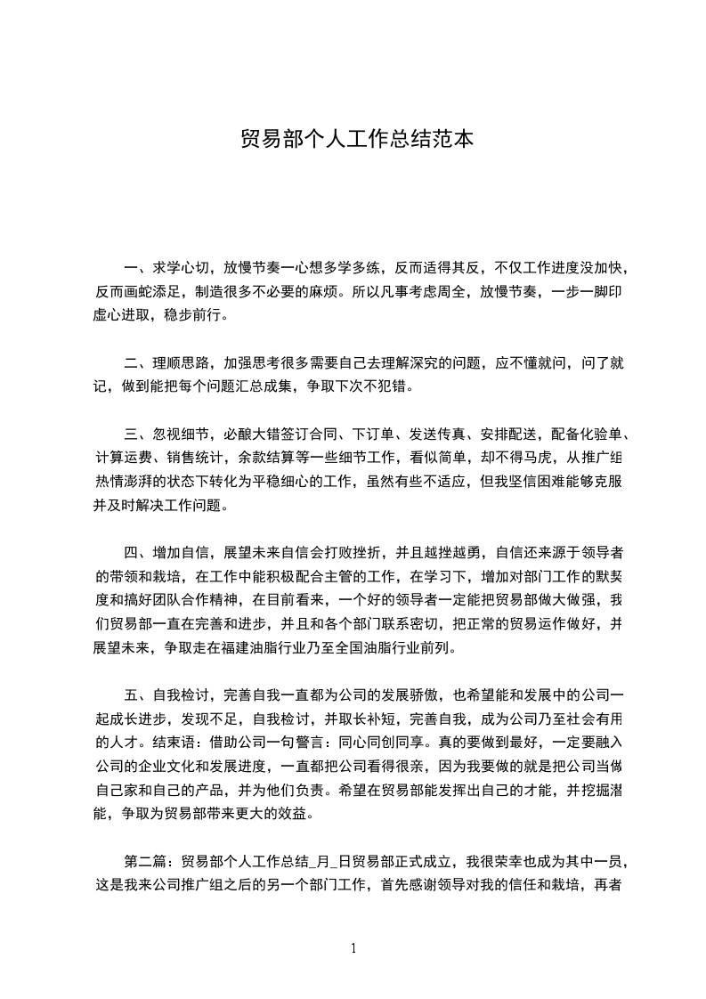 五、自我检讨,完善自我一直都为公司的发展骄傲,也希望能和发展中的公司一起成长进步,发现不足,自我检讨,并取长补短,完善自我,成为公司乃至社会有用的人才。结束语:借助公司一句警言:同心同创同享。真的要做到最好,一定要融入公司的企业文化和发展进度,一直都把公司看得很亲,因为我要做的就是把公司当做自己家和自己的产品,并为他们负责。希望在贸易部能发挥出自己的才能,并挖掘潜能,争取为贸易部带来更大的效益。第五篇:贸易部个人工作总结_月_日贸易部正式成立,我很荣幸也成为其中一员,这是我来公司推广组之后的另一个部门工作,首先感谢领导对我的信任和栽培,再者也希望我能再接再厉,对本部门负责任,尽心尽力做好本职工作,接下来我将对30天来的部门工作进行大体的总结: