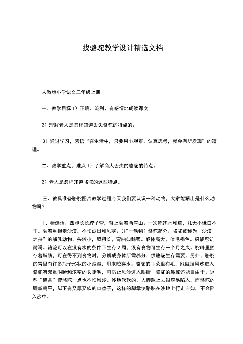 一、设疑导入,提出要求设疑导入。商人走失了一只骆驼,一位老人虽然没有见过那只骆驼,却帮助商人找回了骆驼,你想知道是怎么回事吗?读了找骆驼这篇课文后,同学们就明白了。我们一起来学习找骆驼。(板书课题)提出学习要求。这是一篇略读课文,我们可以根据课文前面的“阅读提示”来学习,并通过自读课文解决问题。