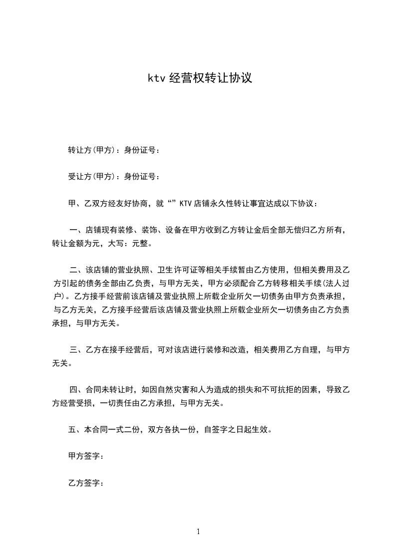 甲、乙双方经友好协商,就“”KTV店铺永久性转让事宜达成以下协议: