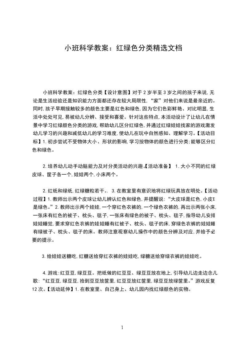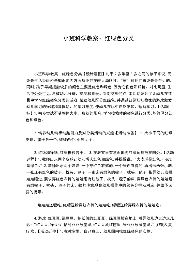 小班科学教案:红绿色分类【设计意图】对于2岁半至3岁之间的孩子来说,无论是生活经验还是知识能力方面都还存在较大局限性,“家”对他们来说是最亲近的。同时,孩子早期接触较多的颜色主要是红色和绿色,因为它们色彩鲜艳、对比明显,生活中处处可见,易被幼儿分辨、接受和喜爱。针对这些特点,本活动设计了让幼儿在情景中学习红绿颜色分类的游戏,帮助幼儿区分红绿色,并通过红绿娃娃找家的游戏激发幼儿学习的兴趣和减低幼儿的学习难度,使幼儿在玩中自然感知、理解学习。【活动目标】1.初步尝试不受物体大小、形状的影响,学习按物体的颜色进行分类;能够区分红色和绿色。