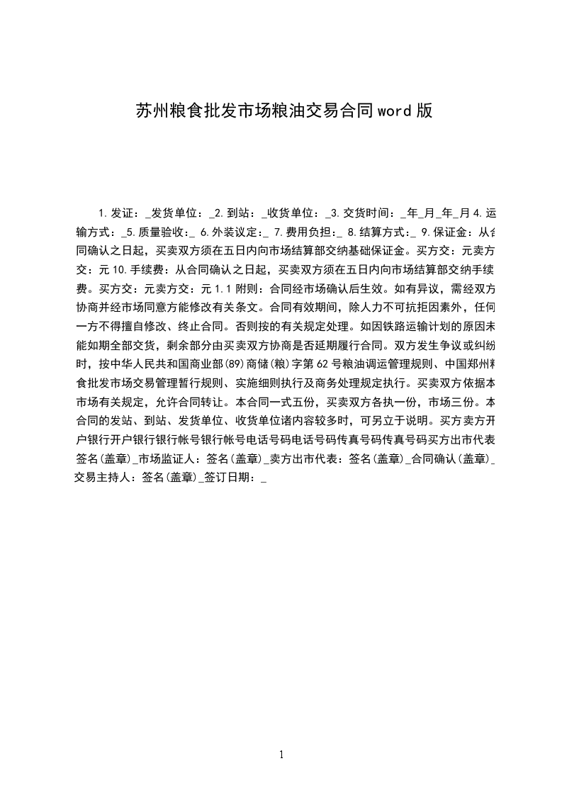 1.1附则:合同经市场确认后生效。如有异议,需经双方协商并经市场同意方能修改有关条文。合同有效期间,除人力不可抗拒因素外,任何一方不得擅自修改、终止合同。否则按的有关规定处理。如因铁路运输计划的原因未能如期全部交货,剩余部分由买卖双方协商是否延期履行合同。双方发生争议或纠纷时,按中华人民共和国商业部(89)商储(粮)字第62号粮油调运管理规则、中国郑州粮食批发市场交易管理暂行规则、实施细则执行及商务处理规定执行。买卖双方依据本市场有关规定,允许合同转让。本合同一式五份,买卖双方各执一份,市场三份。本合同的发站、到站、发货单位、收货单位诸内容较多时,可另立于说明。买方卖方开户银行开户银行银行帐号银行帐号电话号码电话号码传真号码传真号码买方出市代表:签名(盖章)_市场监证人:签名(盖章)_卖方出市代表:签名(盖章)_合同确认(盖章)_交易主持人:签名(盖章)_签订日期:_