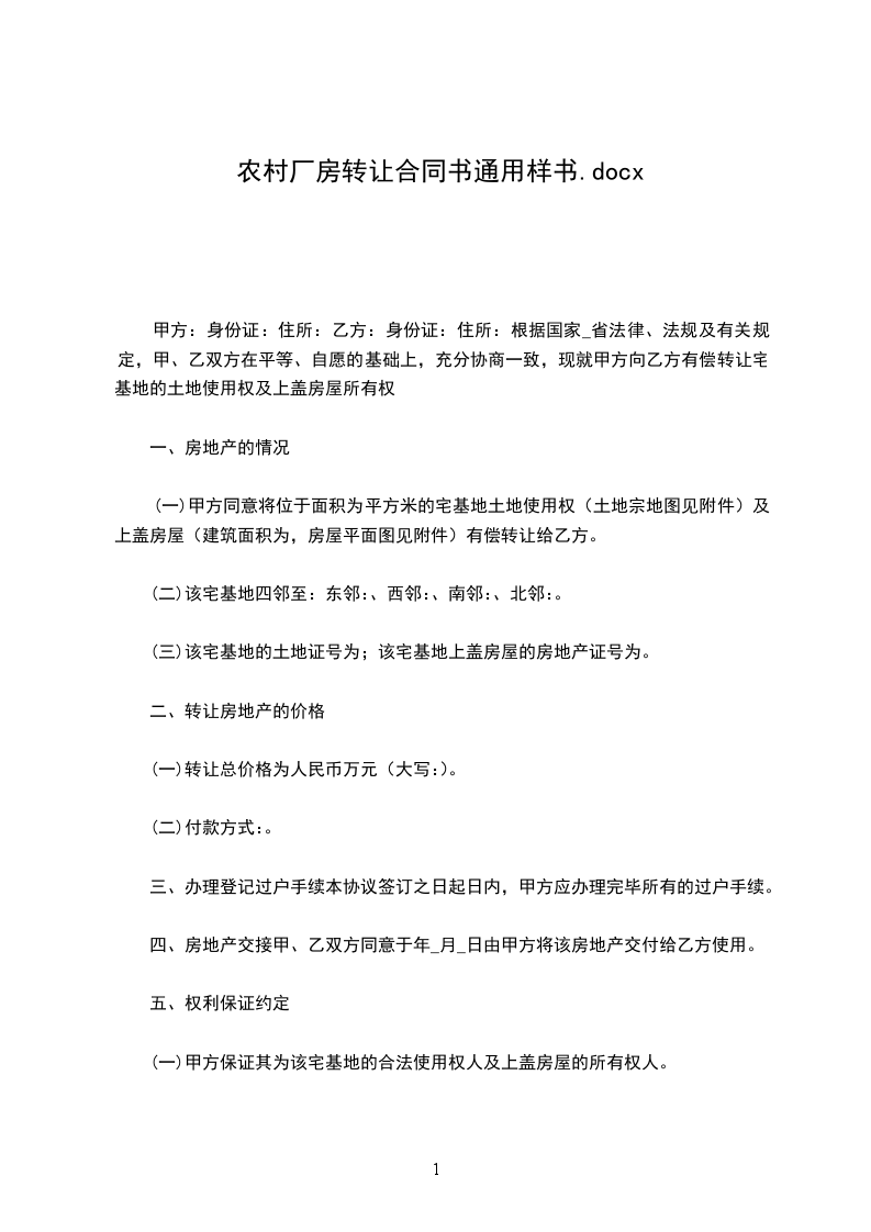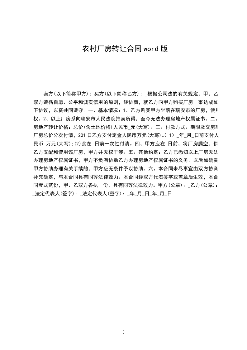 卖方(以下简称甲方):买方(以下简称乙方):_根据公司法的有关规定,甲、乙双方遵循自愿、公平和诚实信用的原则,经协商,就乙方向甲方购买厂房一事达成如下协议,以资共同遵守。