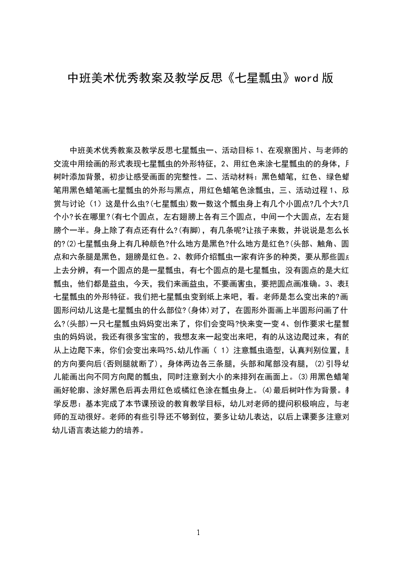 二、活动材料:黑色蜡笔,红色、绿色蜡笔用黑色蜡笔画七星瓢虫的外形与黑点,用红色蜡笔色涂瓢虫,