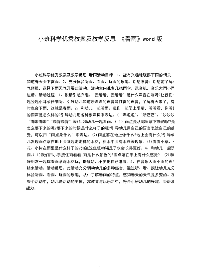 5、在音乐大雨小雨的声中结束活动。自我评析:此活动充分调动幼儿的多种感官,通过听、看、摸让幼儿充分体验听雨、看雨、玩雨的乐趣,从中了解春雨的特点,感知春天的天气是多变的。在整个活动中,幼儿是活动的主体,寓教育与玩乐之中,符合小班幼儿的兴趣、经验和能力。