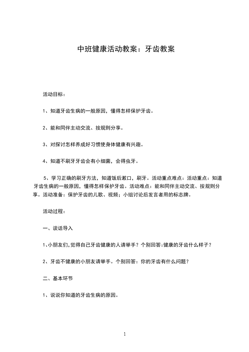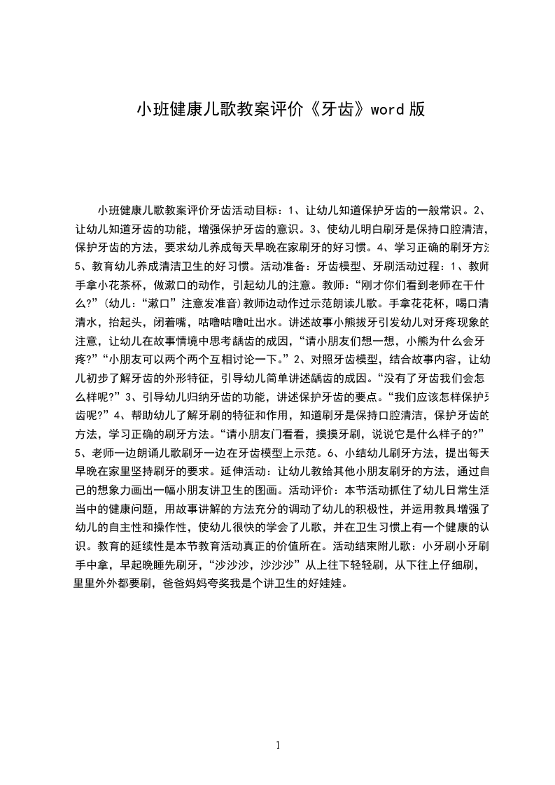 活动评价:本节活动抓住了幼儿日常生活当中的健康问题,用故事讲解的方法充分的调动了幼儿的积极性,并运用教具增强了幼儿的自主性和操作性,使幼儿很快的学会了儿歌,并在卫生习惯上有一个健康的认识。教育的延续性是本节教育活动真正的价值所在。活动结束附儿歌:小牙刷小牙刷,手中拿,早起晚睡先刷牙,“沙沙沙,沙沙沙”从上往下轻轻刷,从下往上仔细刷,里里外外都要刷,爸爸妈妈夸奖我是个讲卫生的好娃娃。
