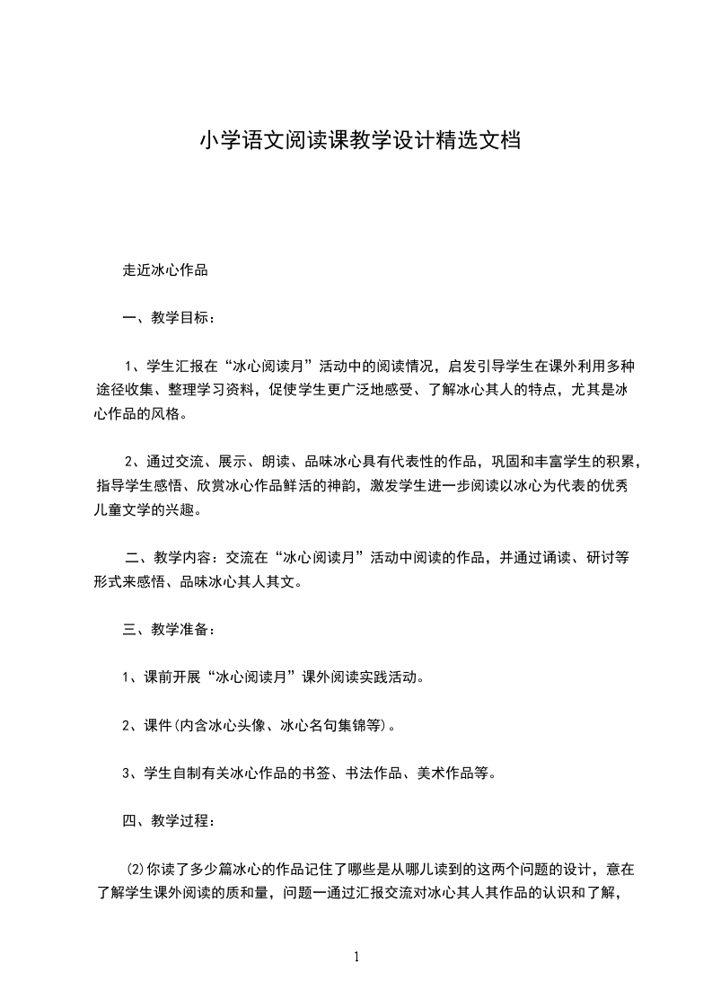 二、教学内容:交流在“冰心阅读月”活动中阅读的作品,并通过诵读、研讨等形式来感悟、品味冰心其人其文。