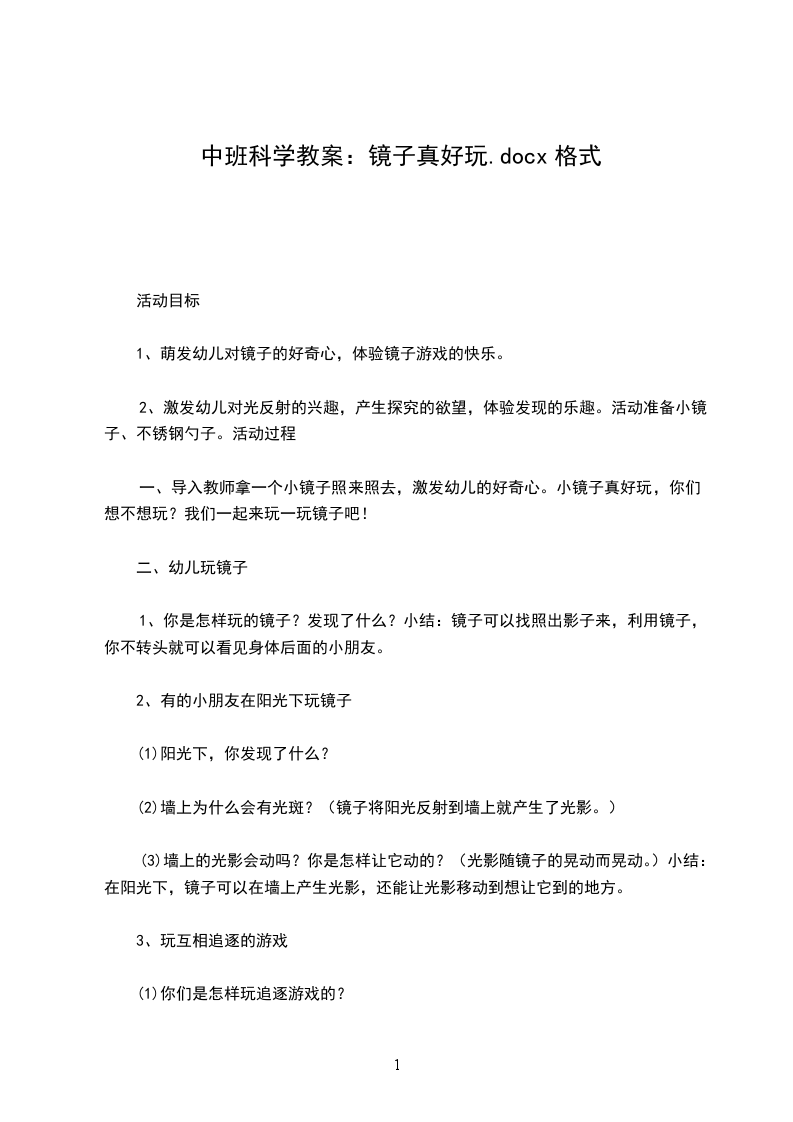 1、你是怎样玩的镜子?发现了什么?小结:镜子可以找照出影子来,利用镜子,你不转头就可以看见身体后面的小朋友。