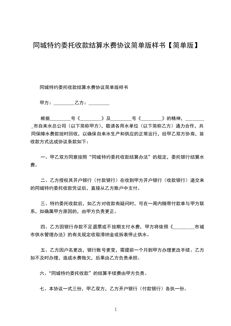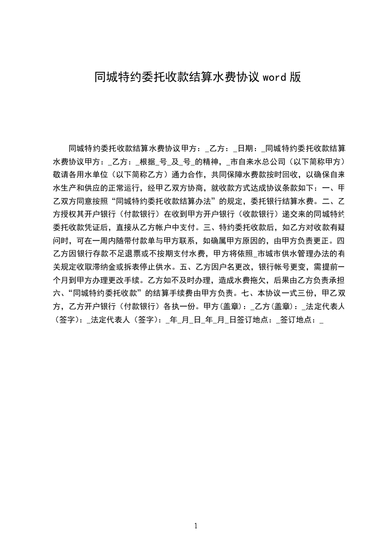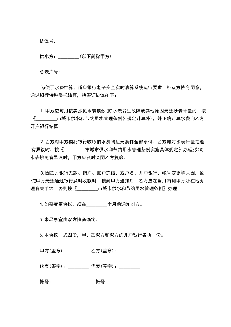 一、甲乙双方同意按照“同城特约委托收款结算办法”的规定,委托银行结算水费。