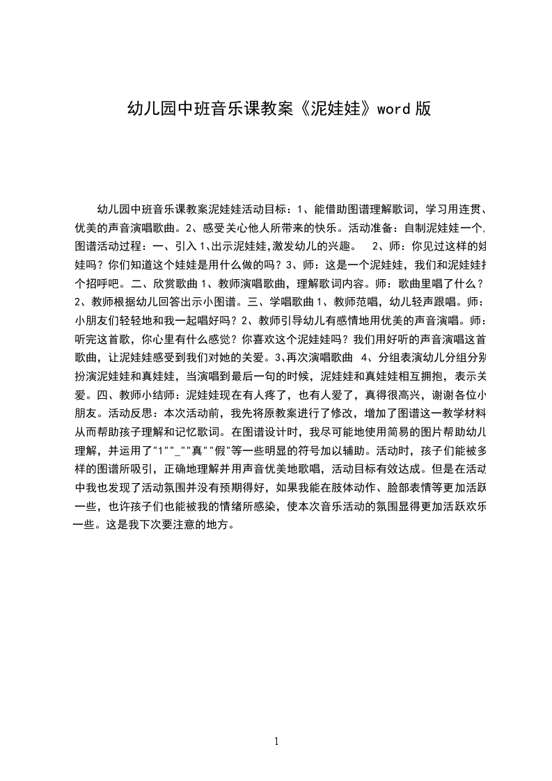 四、教师小结师:泥娃娃现在有人疼了,也有人爱了,真得很高兴,谢谢各位小朋友。活动反思:本次活动前,我先将原教案进行了修改,增加了图谱这一教学材料,从而帮助孩子理解和记忆歌词。在图谱设计时,我尽可能地使用简易的图片帮助幼儿理解,并运用了"1""_""真""假"等一些明显的符号加以辅助。活动时,孩子们能被多样的图谱所吸引,正确地理解并用声音优美地歌唱,活动目标有效达成。但是在活动中我也发现了活动氛围并没有预期得好,如果我能在肢体动作、脸部表情等更加活跃一些,也许孩子们也能被我的情绪所感染,使本次音乐活动的氛围显得更加活跃欢乐一些。这是我下次要注意的地方。