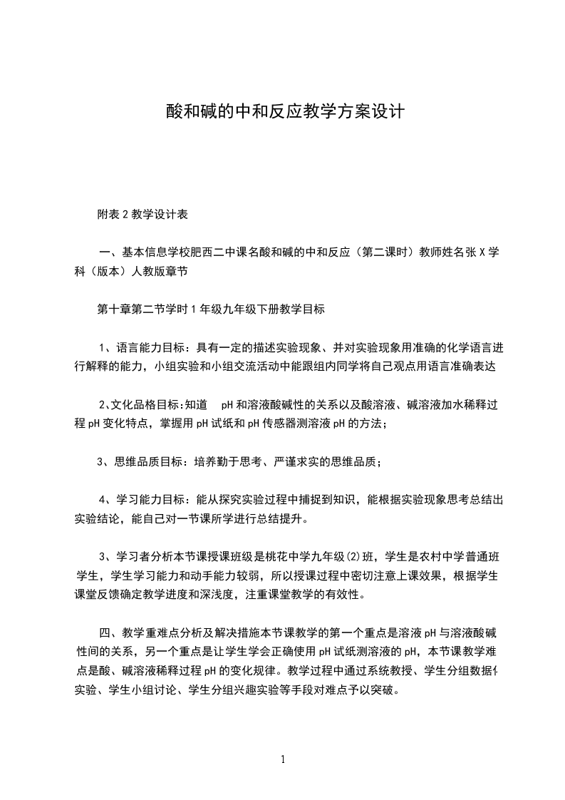 一、基本信息学校肥西二中课名酸和碱的中和反应(第二课时)教师姓名张X学科(版本)人教版章节