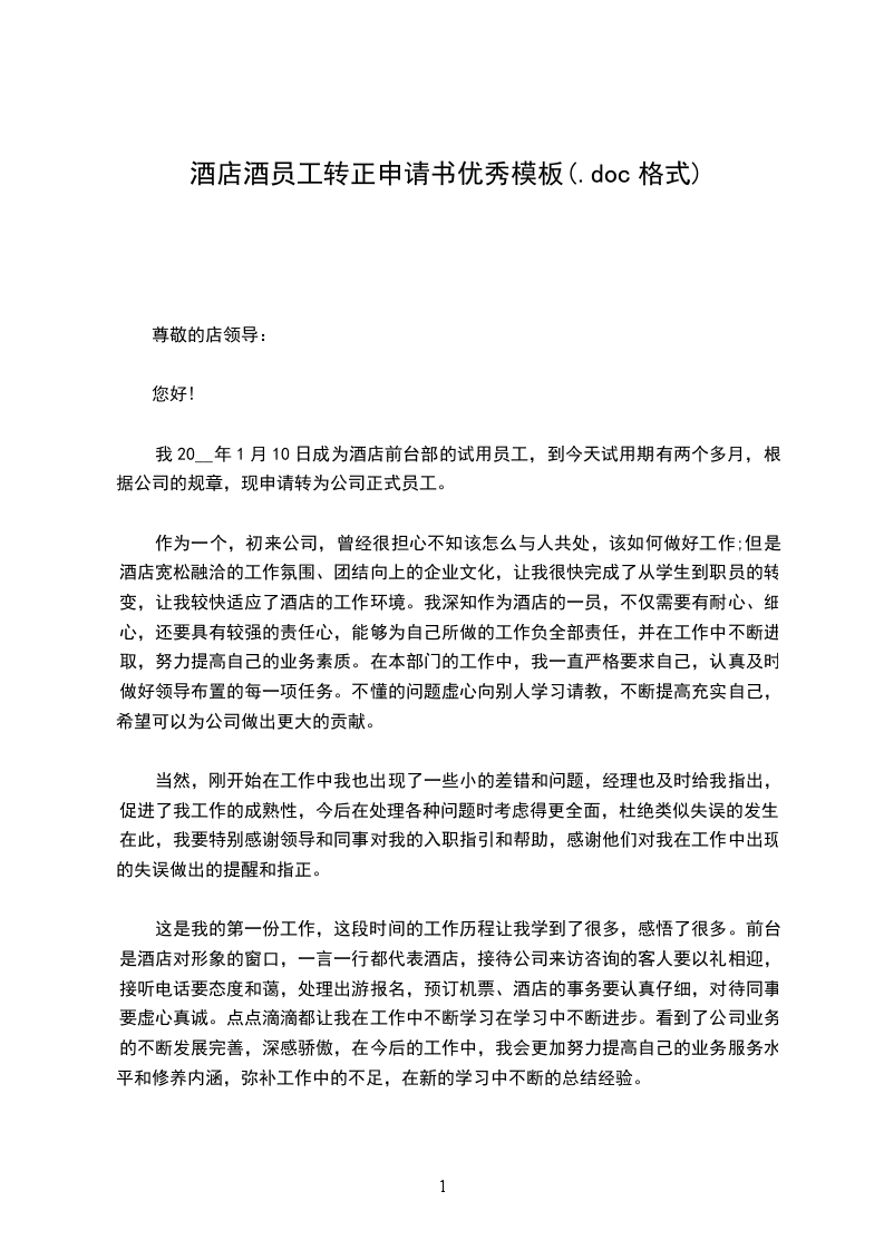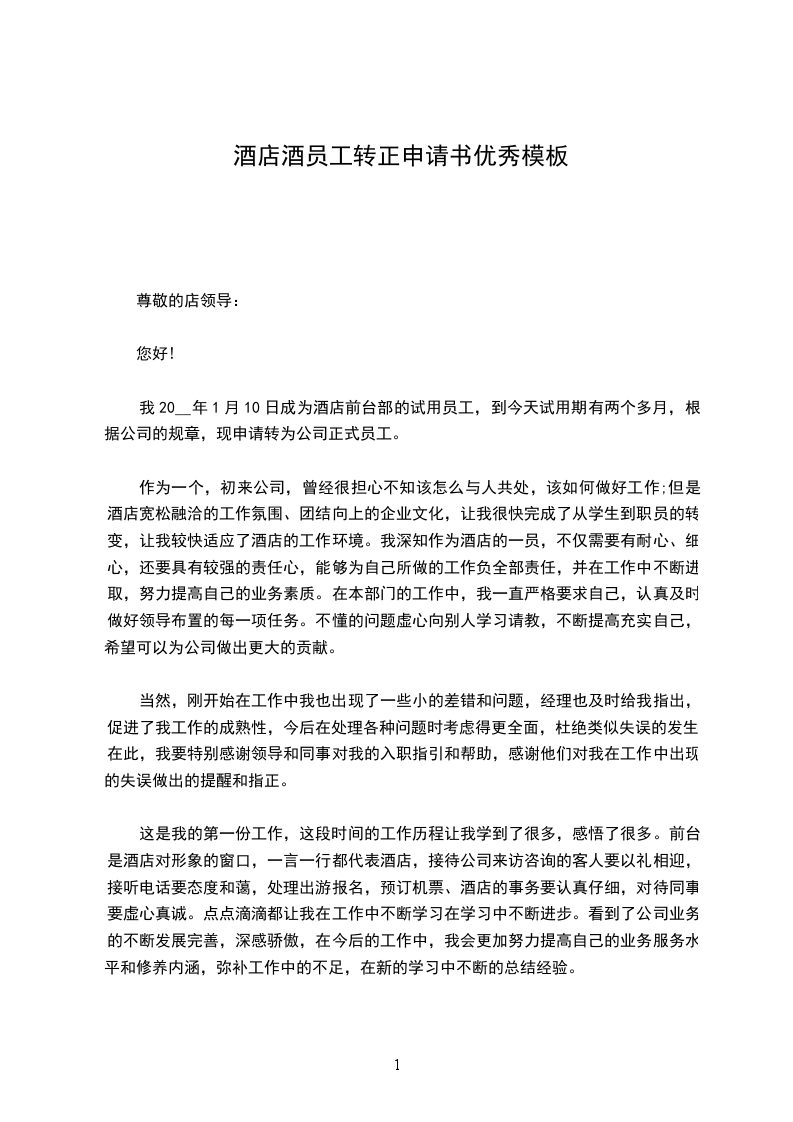 我20__年_月_日成为酒店前台部的试用员工,到今天试用期有两个多月,根据酒店的规章制度,现申请转为酒店正式员工。