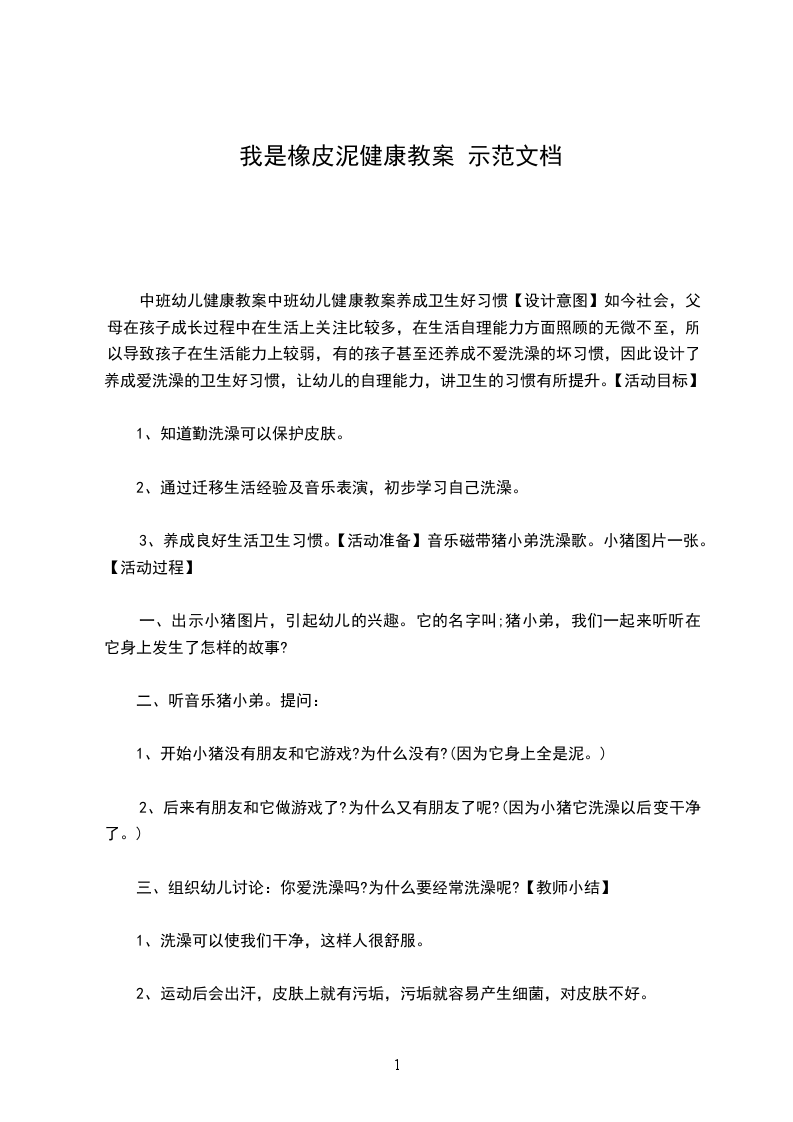 中班幼儿健康教案中班幼儿健康教案养成卫生好习惯【设计意图】如今社会,父母在孩子成长过程中在生活上关注比较多,在生活自理能力方面照顾的无微不至,所以导致孩子在生活能力上较弱,有的孩子甚至还养成不爱洗澡的坏习惯,因此设计了养成爱洗澡的卫生好习惯,让幼儿的自理能力,讲卫生的习惯有所提升。【活动目标】