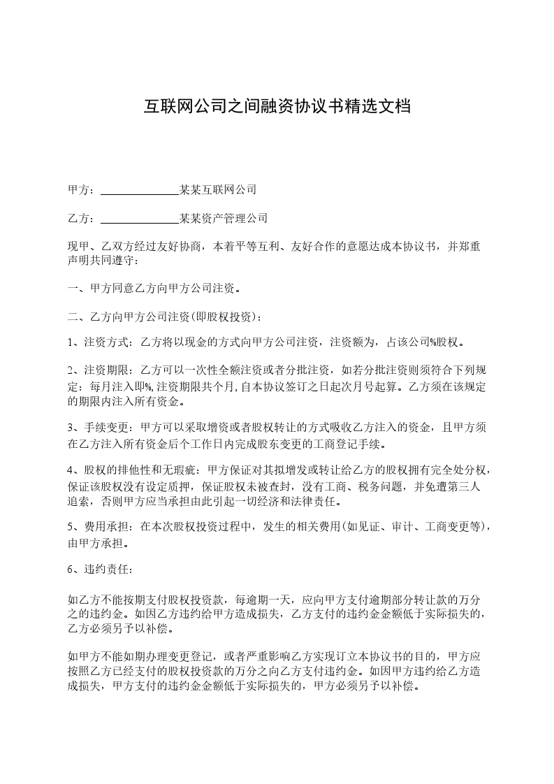 可以参考下面的格式来写互联网公司融资协议书