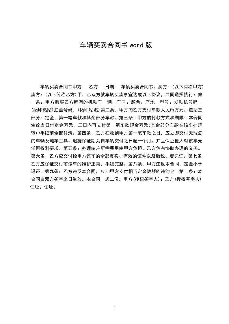 第一条:甲方购买乙方所有的机动车一辆:车号:颜色:产地:型号:发动机号码:(拓印粘贴)底盘号码:(拓印粘贴)