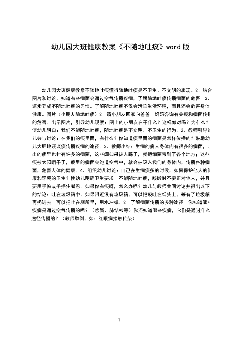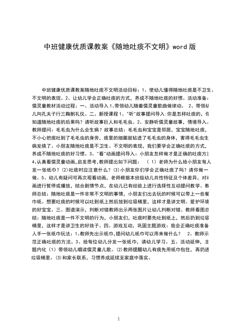 一、引出课题孩子们,当我们在美丽的花店或者在美丽的展览厅里,突然发现在地上有一堆浓痰,那么此时此刻你的心情会怎么样呢?老师,父母们也经常告诉我们不要随地吐痰,那么你们知道为什么不能随地吐痰吗?吐痰又有些什么害处呢?幼儿讨论。