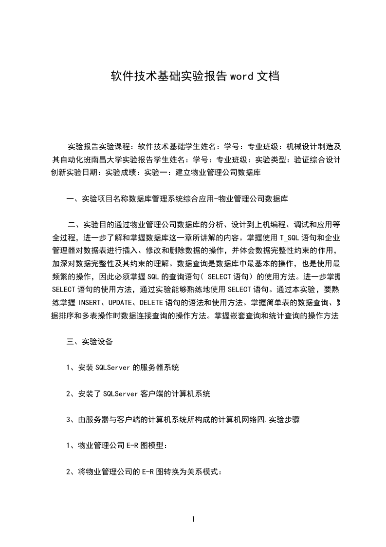 实验报告实验课程:软件技术基础学生姓名:学号:专业班级:机械设计制造及其自动化班南昌大学实验报告学生姓名:学号:专业班级:实验类型:验证综合设计创新实验日期:实验成绩:实验一:建立物业管理公司数据库