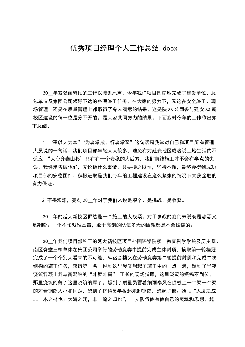 20__年紧张而繁忙的工作以接近尾声,今年我们项目圆满地完成了建设单位、总包单位及集团公司领导下达的各项施工任务,在大家的努力下,无论在安全施工、现场管理,还是在质量管理上都取得了令人满意的结果,这是陕XX公司参与延安XX新校区建设的每一位是分不开的,是大家共同努力的结果,下面我对今年的工作作出如下总结: