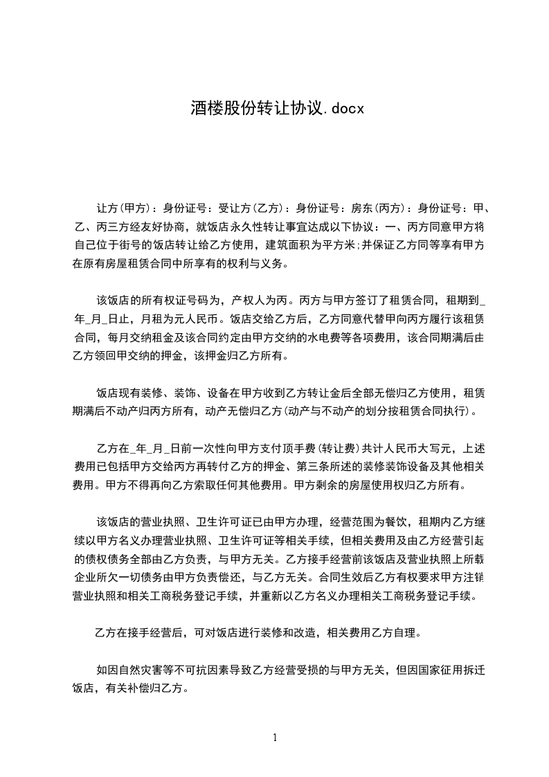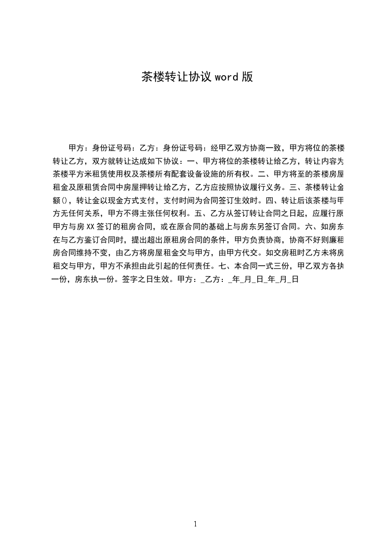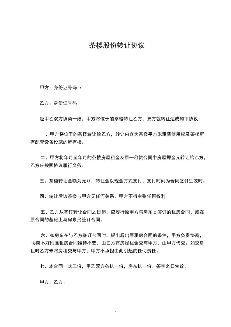 一、甲方将位于的茶楼转让给乙方,转让内容为茶楼平方米租赁使用权及茶楼所有配套设备设施的所有权。