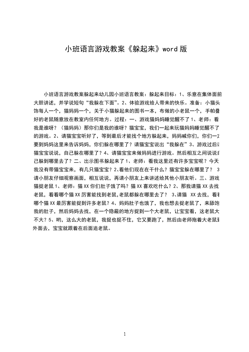 2、体验游戏给人带来的快乐。准备:小猫头饰每人一个,猫妈妈一个,关于小猫躲起来的图书一本,布做的小老鼠一个,手帕叠好的老鼠随意放在教室内任何地方。过程: